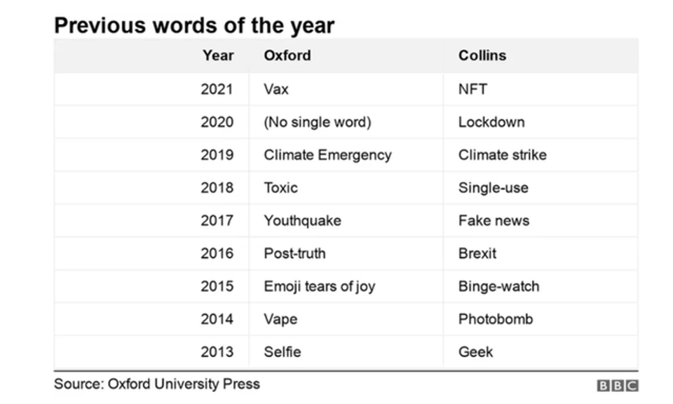 图 | 2013-2021年牛津年度热词(第一列)与柯林斯年度热词(第二列)(来源:牛津大学出版社官网)