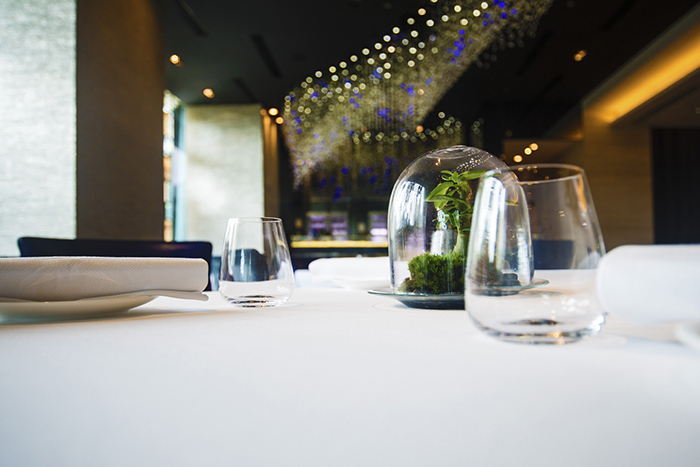 座位的布局上既有靠窗的两人座、四人座,也有更具私密性的包厢。餐桌的布置倒是简约,用艺术品或绿植点缀,这和米其林南法店 Mirazur 的桌面布置保持一致。