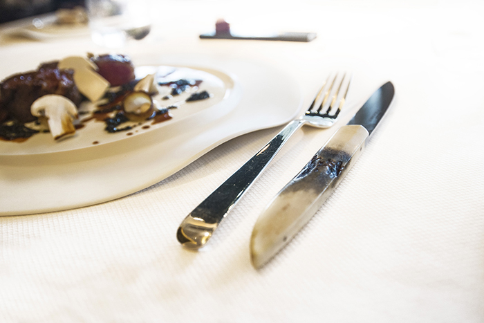 与简约的餐桌设计相对应的,是讲究的餐具,不论是从国外精选的餐具,还是 Azur 定制款的麋鹿角把手牛排刀,都为用餐增添了用心的细节。