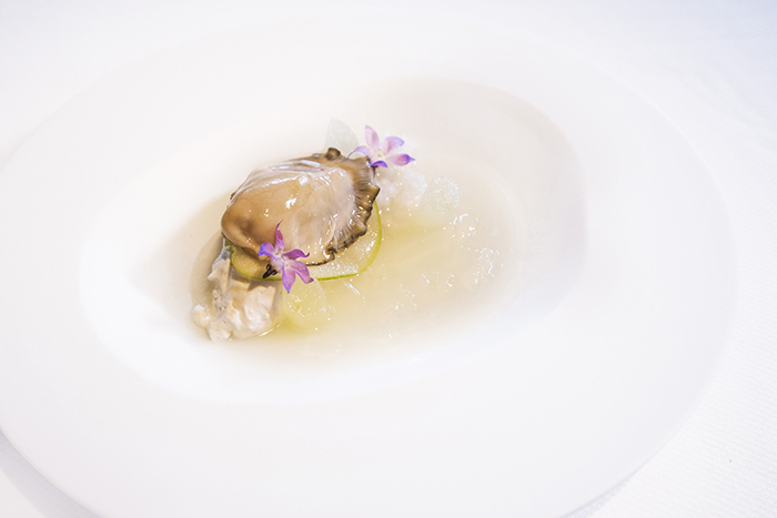 咸鲜的吉拉多生蚝,在浇上威廉姆梨汁后既掩盖了海鲜的微腥,又增添了清甜。咸与甜的配比,形成了相得益彰的平衡,配合调味的干葱奶油,衬托得吉拉多生蚝口感更加爽脆