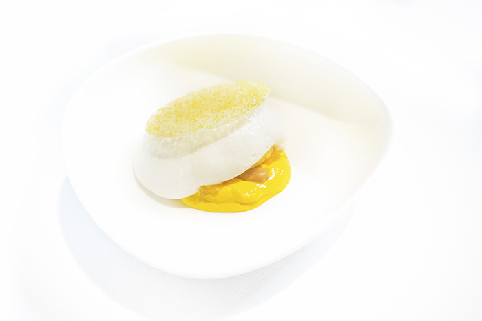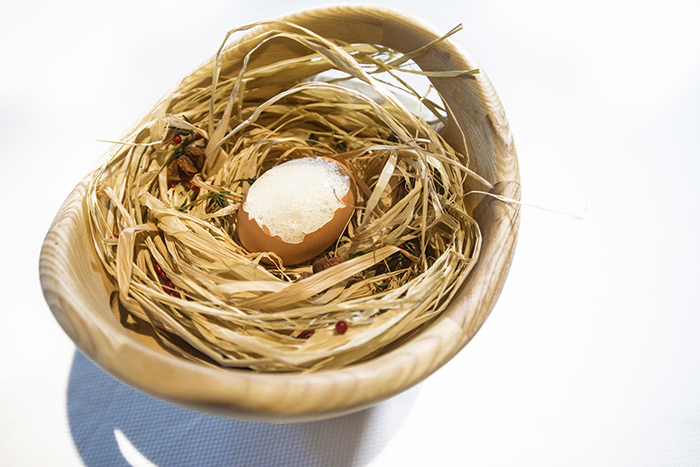 这道菜看起来就像是巢中一枚不完整的蛋,一勺下去,温润的溏心蛋黄开始慢慢向外溢出,搭配奶油味的泡沫。这道看似朴实的菜温暧了肠胃,为接下来的主菜做好了准备。
