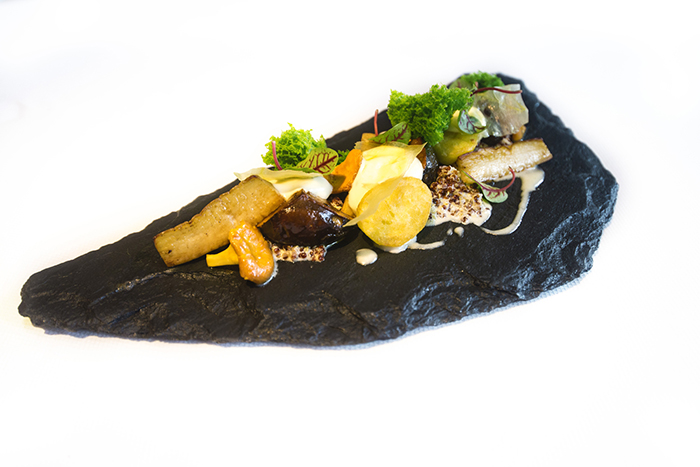 这道菜食材非常丰富,菜叶、土豆、蘑菇,配以藜麦制作的薄脆配以用蔬菜汁煮过的海藻,模拟出森林中树、石、青苔的景致。