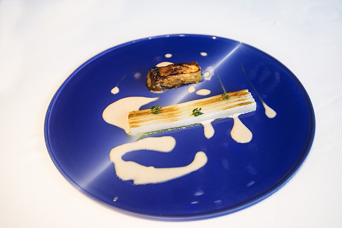 从口感上几乎改变了对于鱿鱼的认知,为求入味整段鱿鱼从中间平行划开烹饪。搭配茄子和银鱼蒜香酱汁,整体口感饱满弹牙,嚼起来却不费事。是一道考研刀工和烹饪技术的菜。