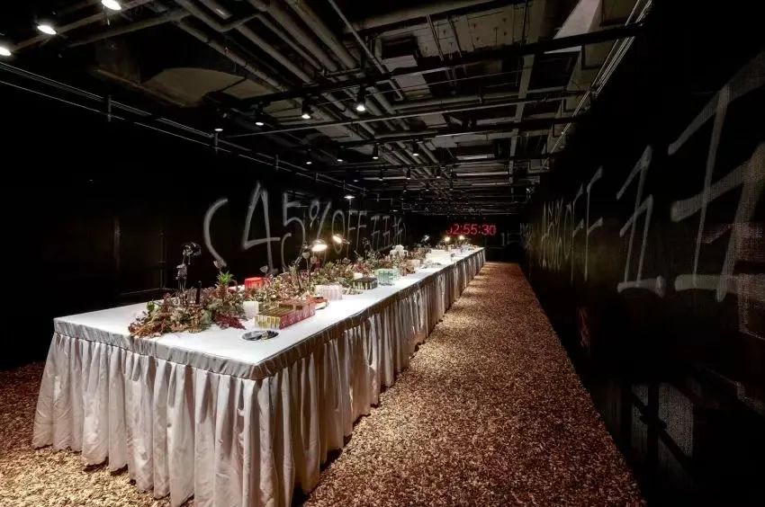 三是以密室形式进行场景创新。不同于一般HARMAY話梅的仓储工业风,簋市的设计为暗黑微恐风,类似于密室逃脱。整个门店被分为饕餮、瓶储、马厩等 7 个区域。当消费者进入门店后,可获得一张地图,其需按固定路线,以“寻宝”方式进入不同区域,不能逆行回头走。