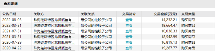 以龙狮瓶盖为例,据wind发布的数据显示,茅台和龙狮瓶盖每年会有两次进行关联交易,分别在每年的一季度、三季度,单笔关联交易的金额均在1亿元以上。