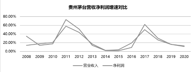 对于贵州茅台来说,由于业务过于依赖白酒,营收结构相对单一,与上市公司业绩涨跌高度重合。但在经历此前的快速发展后,目前茅台的营收和净利润增速不断创下新低。