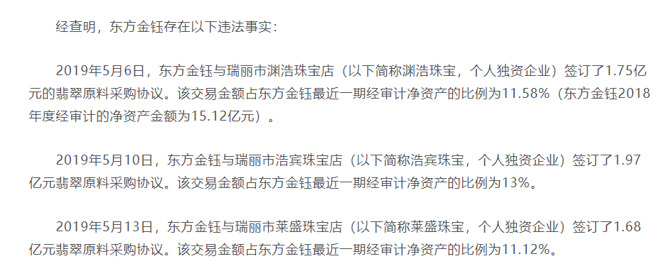 2016年12月到2018年5月,有着珠宝界“瑞幸”之称的东方金钰为完成营收、利润等业绩指标的上涨,虚构与其控制的宏宁珠宝有限公司、普日腊、保生、自孔堵、张国梅等六名自然人名义客户之间的翡翠原石销售交易,虚增利润3.5亿元。