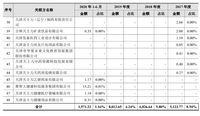 而公司的第一大客户天津帝泊洱生物茶连锁有限公司,在2017年到2019年向国台所采购的金额分别为3641.08万元、4816.56万元、4661.46万元,占同期关联交易总额的比例分别为71%、70.55%、57.9%,占国台酒业营收比例分别为6.36%、4.09%、2.47%。