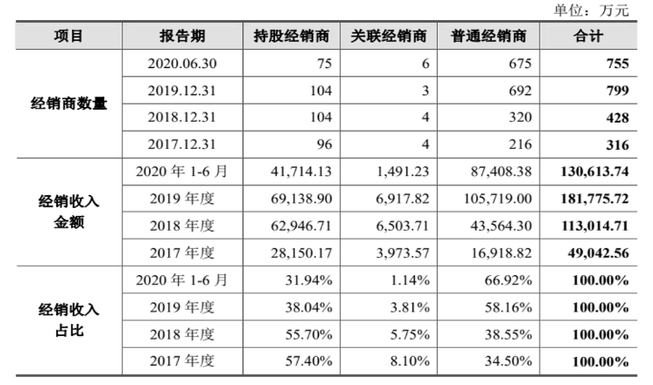 另外,国台酒业104家经销商持股比例为25.96%,在2017年—2019年,持股经销商加关联经销商占到经销收入的65.5%、61.45%、41.85%,截至2020年上半年,两者合计占比仍高达33.08%。