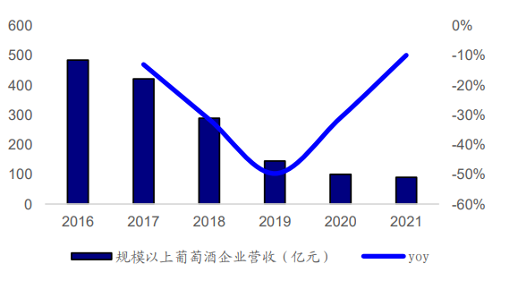 同时,2021年规模以上葡萄酒企业营收为90.3亿元,较2016年减少81.4%,期间CAGR为-28.5%。换句话说,目前国内葡萄酒市场是一个减量市场,而非一个增量市场。
