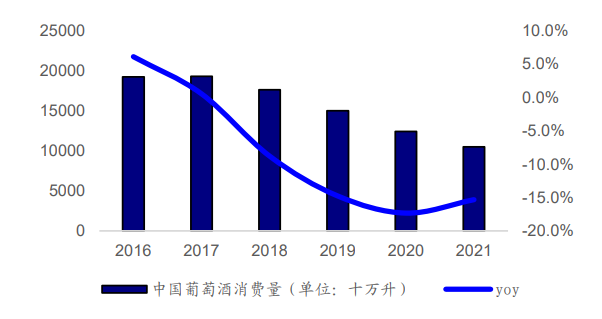 以茅台葡萄酒公司为例,据国际葡萄与葡萄酒协会数据显示,自 2017 年以来中国葡萄酒消费量连续下降,2021年中国葡萄酒的消费量为10.5亿升,较2016年减少45.3%,期间CAGR为-11.4%。