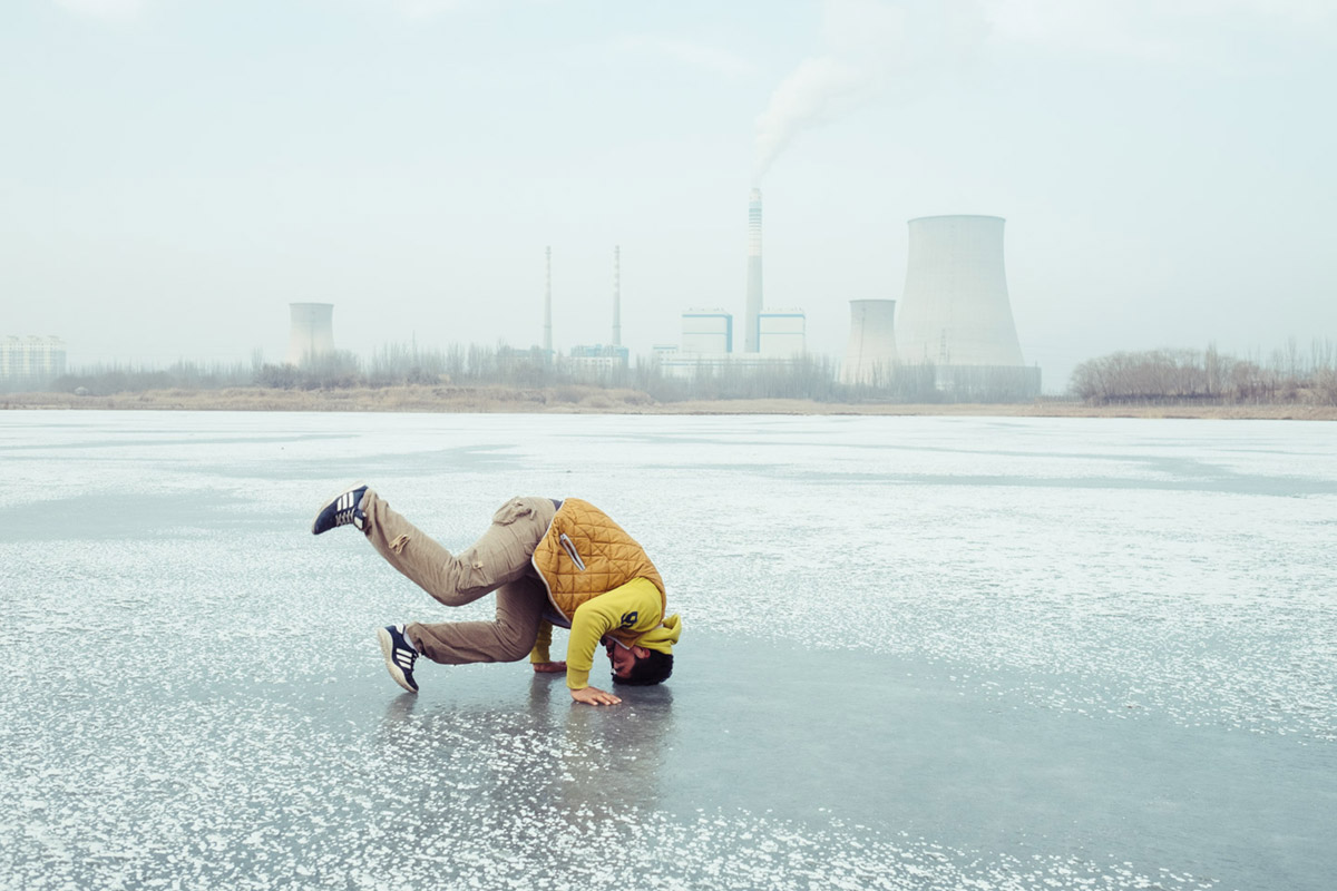 一个男人正试着在小亚郎水库的冰面上拿大顶。喀什,新疆,2016。