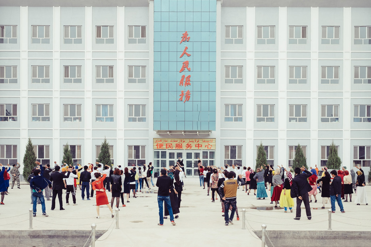 维吾尔族村民在每周一次的例会上接受当地干部的现代化培训,主要内容是反对极端主义,展示香港或者上海的现代化。政府认为这有助于对抗分裂主义。喀什,新疆,2016