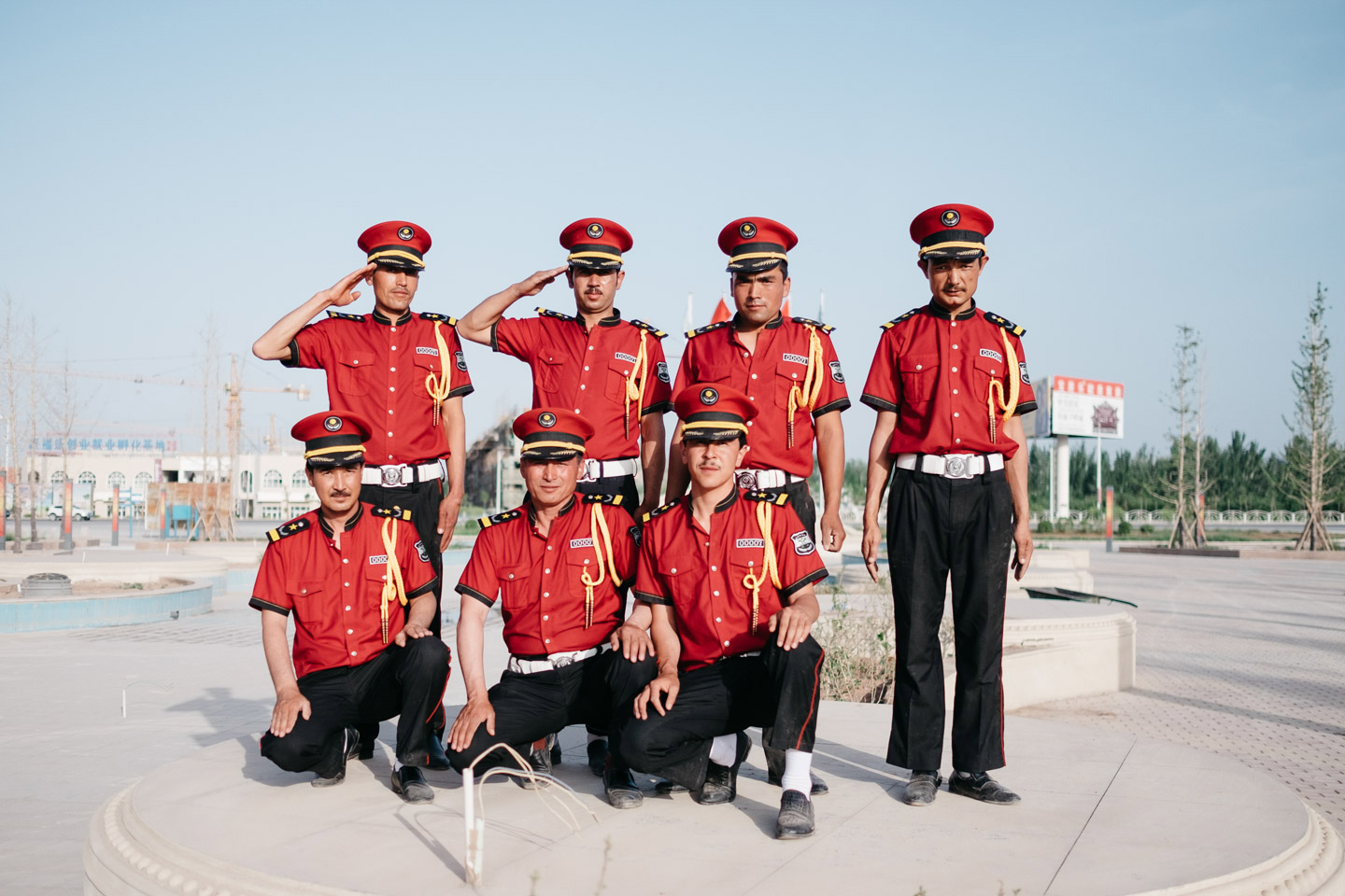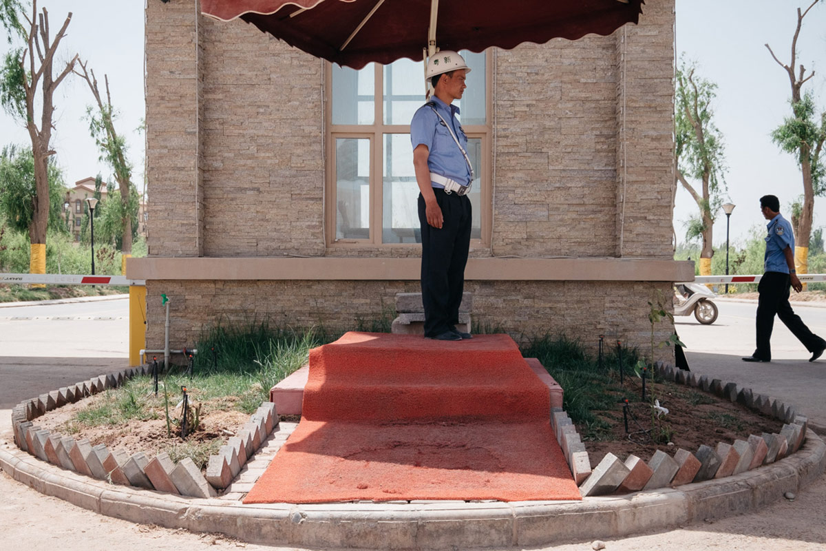 维吾尔族保安站在“疆南威尼斯”别墅区门口。喀什,新疆,2015