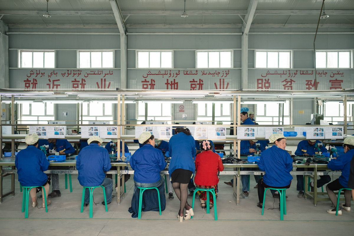 维吾尔族工人在自家附近的广州思科电子工厂内,他们的月工资约1500-2000人民币(相当于200-300美元)。喀什,新疆,2015