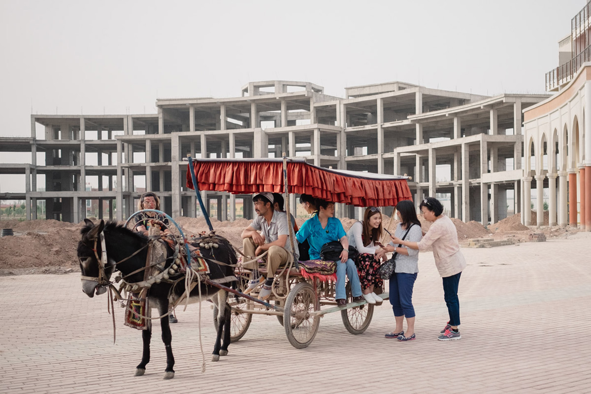 在广州新城,人们正等着练车,背景中是刚刚被建起的新公寓楼房。喀什,新疆。
