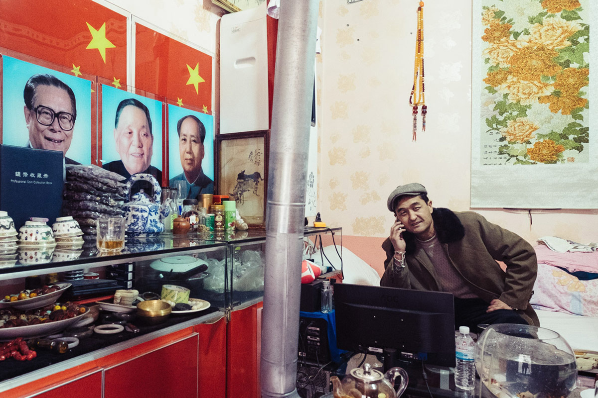 36岁的Mehmet在喀什的旅游街上做古玩和玉石生意,他是毛泽东和邓小平的拥趸。喀什,新疆,2016