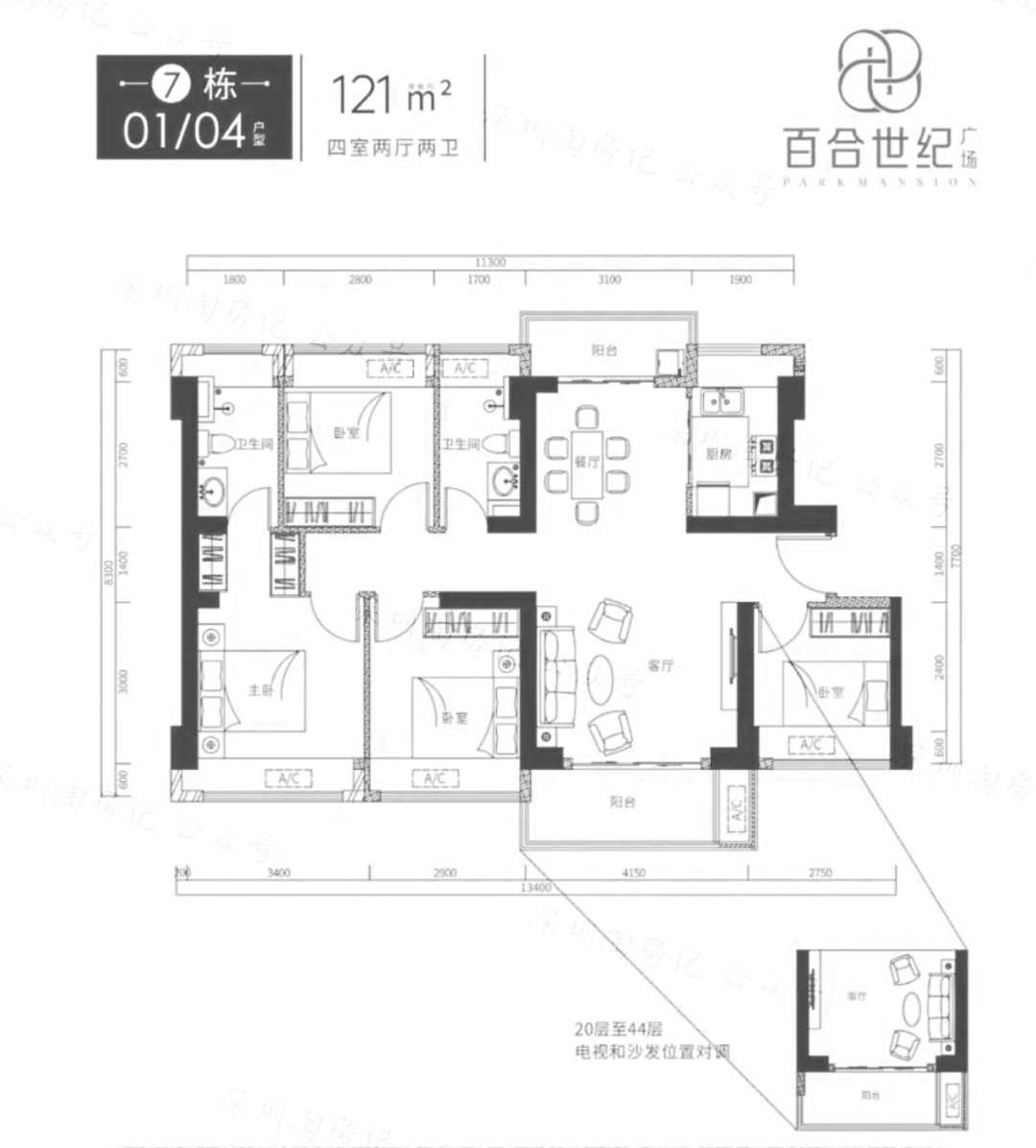 目前只释放出7栋01、04户型121㎡4房2厅户型。