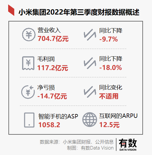 最核心的指标,营收和净利润在连续三个季度的下滑之后,净利润已经跌成负数——三季度净亏损14.7亿元。以小米的出货量简单计算,大约每卖一部手机,净亏22元。