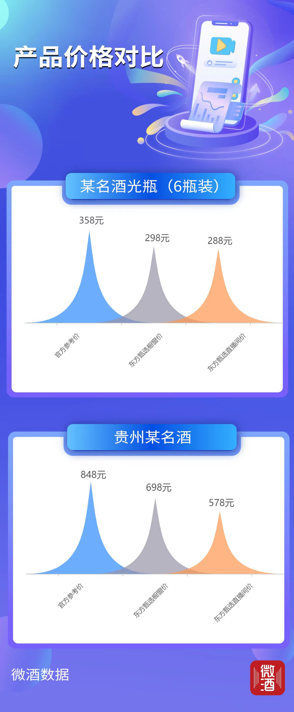 例如,某光瓶白酒(6瓶装)官方参考价是358元,方甄选橱窗价格298元,“东方甄选将进酒”直播间内仅售288元;贵州某名酒的官方参考价是848元,东方甄选橱窗价格698元/瓶,直播间578元/瓶……