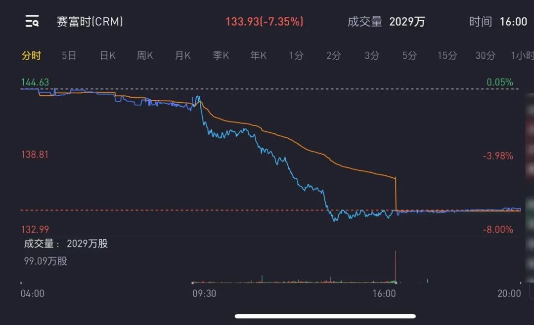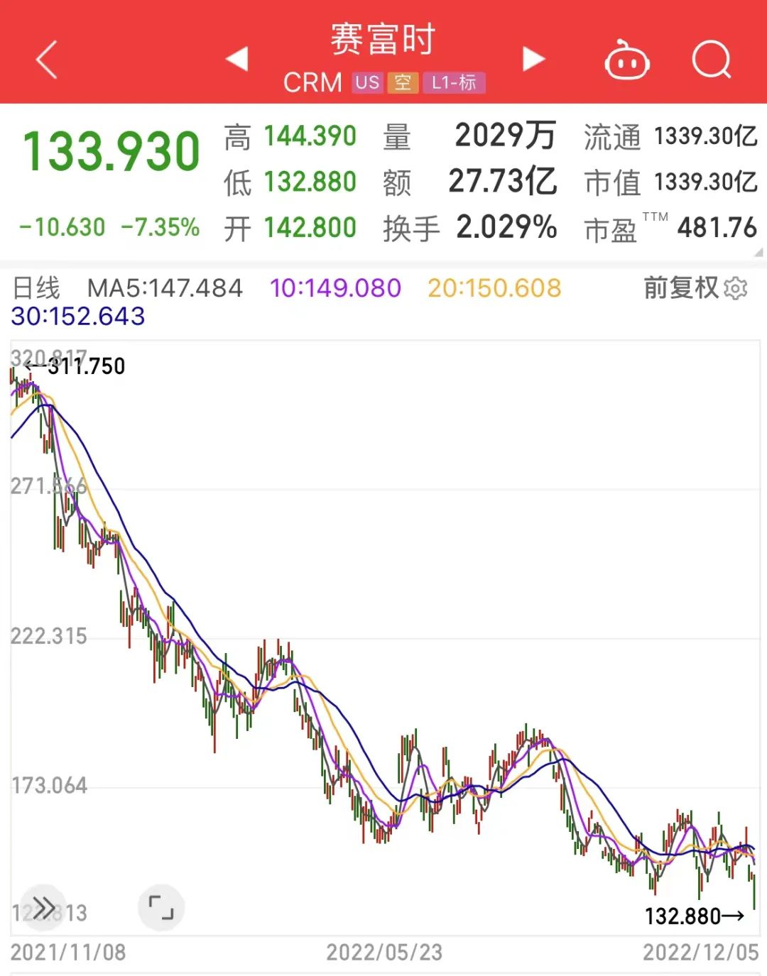 ▲Salesforce近一年来估计下跌超50%(图源同花顺App)