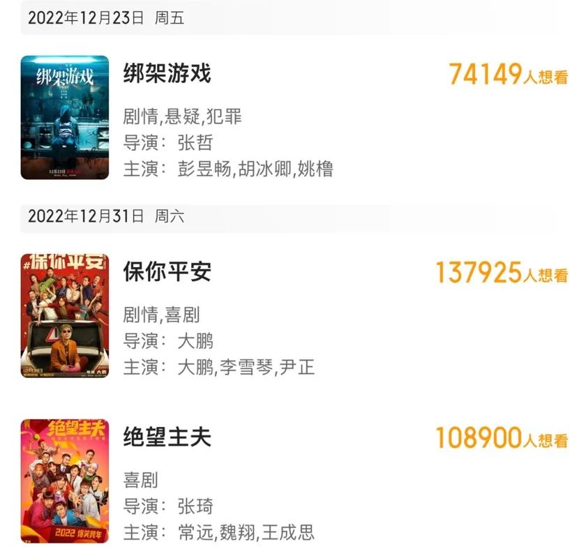 截止发稿前,被视为贺岁档国产片三大支撑的《绑架游戏》《保你平安》《绝望主妇》的猫眼想看人数分别为7万+、13万+、10万+。