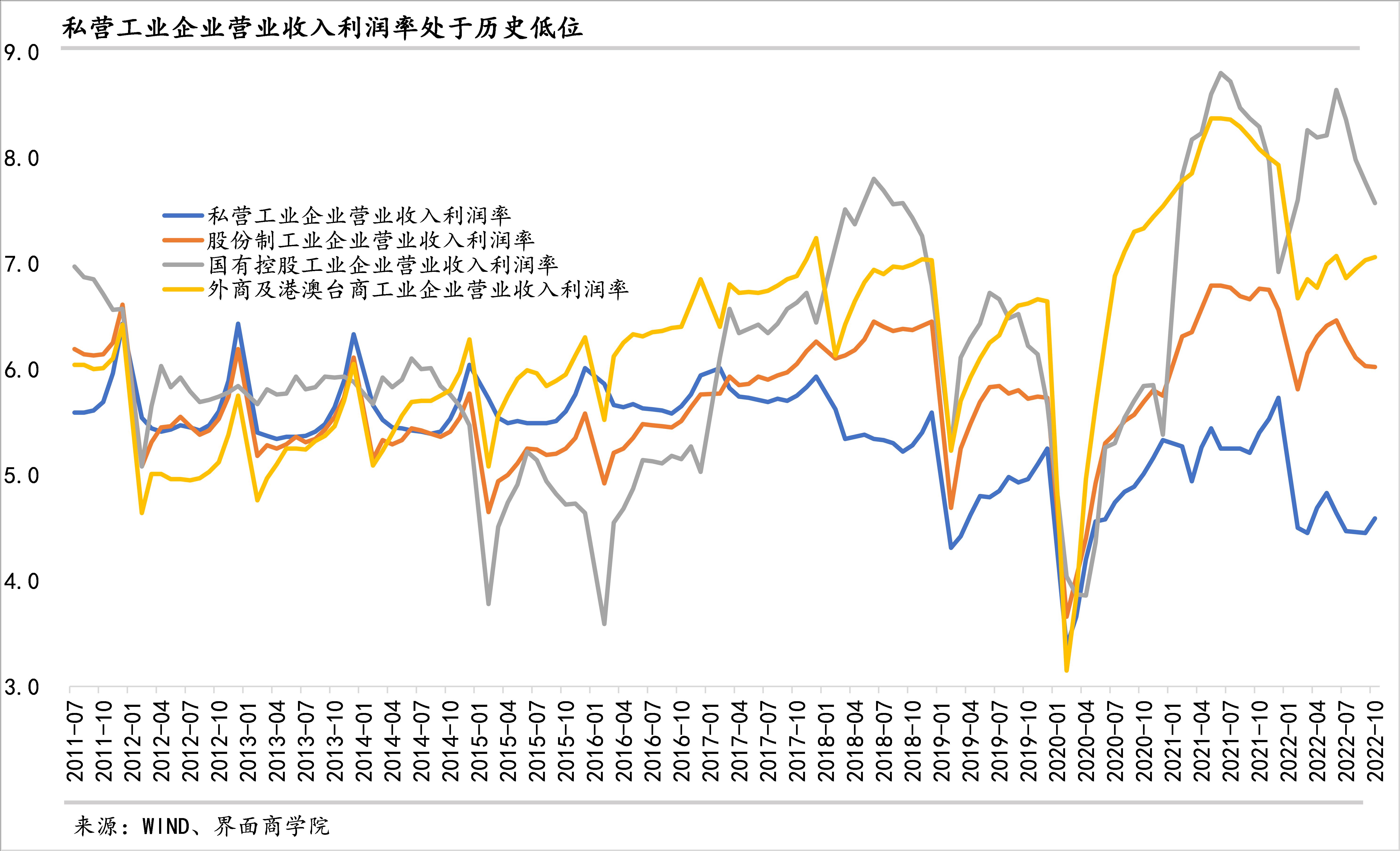 过去两年,不同类型工业企业营业收入利润率的差距拉大,今年则更为明显。国有控股企业显著高于其他类型企业,外商及港澳台企业次之,私营企业最低。截至10月份,私营工业企业营业收入利率润录得4.59%,处于历史低位。
