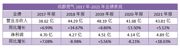 从业绩上来看,2017年到2021年间,成都燃气营业收入最高的是2019年,为48.19亿,同比增长8.80%;净利润最高的是2021年,为4.89亿,同比增长18.03%。