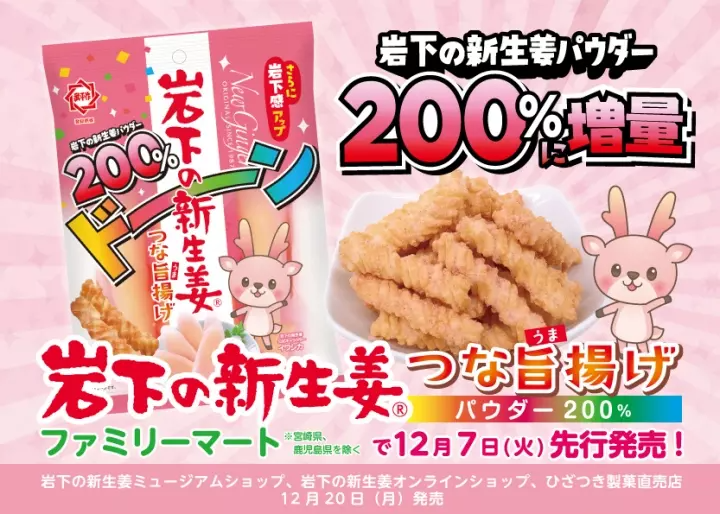 无独有偶,HIZATSUKI制果也曾在去年推出过一款名为岩下新生姜炸酥条(岩下の新生姜つな旨揚げ)的姜味零食。这款麻花形的酥条以岩下的新姜为形象,添加了比以往产品多200%的调味粉。消费者可以感受到岩下新姜特有的温和辣味、清爽的香气和恰到好处的酸味,酥脆鲜美的口感也会让顾客们流连忘返,十分具有记忆点。
