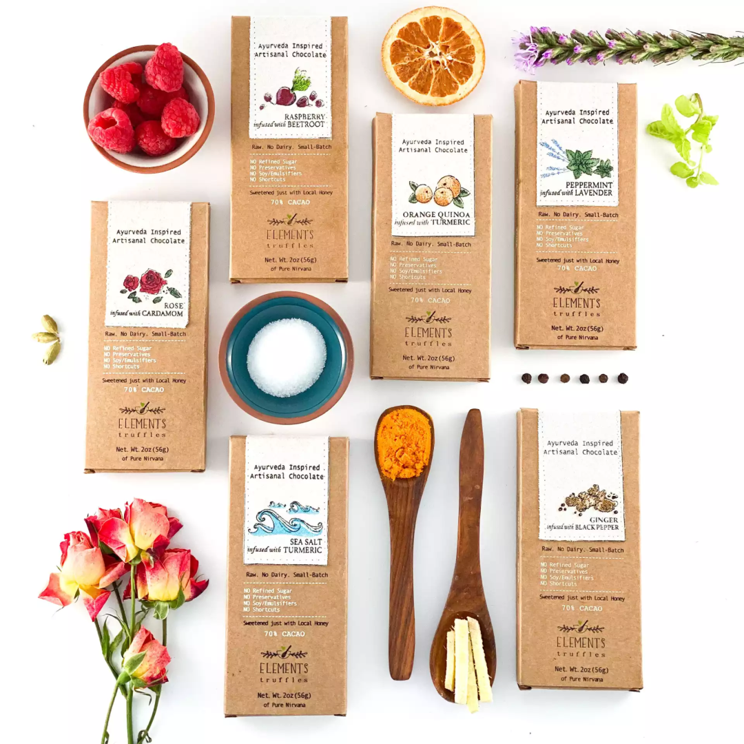 巧克力制造商 Elements Truffles 则从阿育吠陀疗法获得了灵感,推出了包含六种口味的“松露”巧克力棒(黑胡椒姜、豆蔻玫瑰、姜黄橙藜麦、薰衣草薄荷、姜黄海盐、覆盆子配甜菜根)。该款巧克力采用了 70% 的厄瓜多尔可可,百分百手工制作而成,且不含乳制品、不含乳制品、精制糖、大豆、防腐剂、麸质、棕榈油、转基因生物和任何人造物质,均利用天然植物本身风味制成。同时带有精致的花香和催情效果,十分宜人心脾。