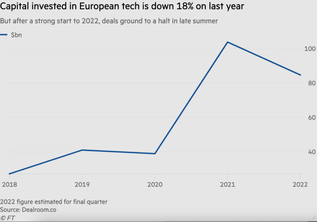 在高利率、俄乌冲突、人才储备萎缩等一系列因素的冲击下,欧洲公共和私营科技公司的总价值从2021年底的3.1万亿美元降至2.7万亿美元。