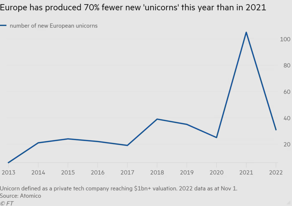欧洲今年新增独角兽企业数量较去年大降70%(图源:英国《金融时报》)