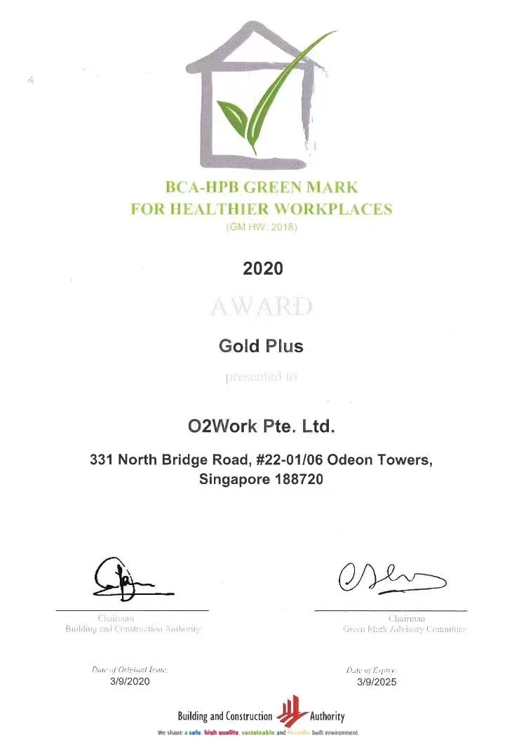 2020年,O2Work获得新加坡建设局(BCA)颁发的室内空间绿色认证(Green Mark)超金奖(Gold Plus),是新加坡共享办公空间中第一且唯一获得此项认证的品牌。