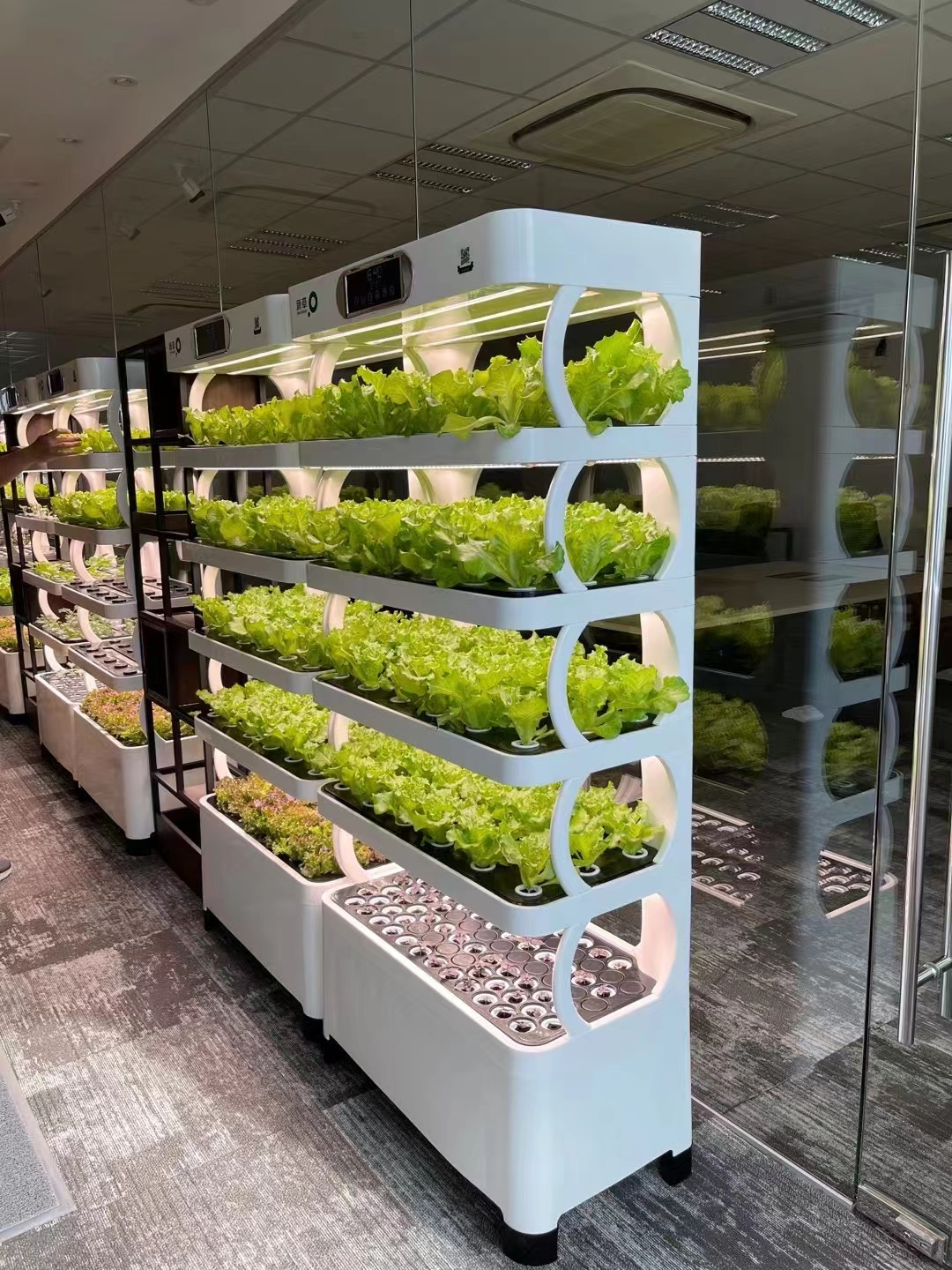“在办公空间内种植蔬菜,一方面可以起到观赏效果,绿色植物可以帮助白领们缓解视觉疲劳和精神压力;另一方面,植物可以释放负氧离子,帮助净化室内空气。”刘珍妮说:“我们每个空间会有几十台室内农场,每台有5层,因此它的产量也非常可观。这个系统从播撒种子到最终采收只需要三周左右的时间,我们会有专门的团队去养护、采收、打包,分享给我们O2Work的会员和职员们直接带回家食用。”