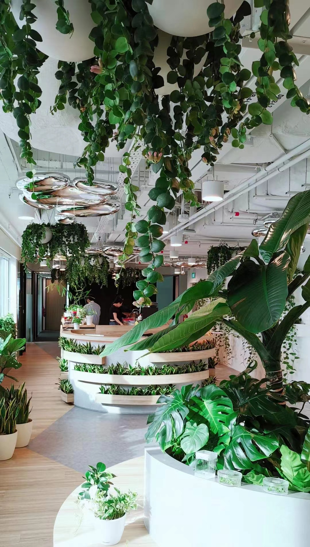 室内正中央,一株茁壮茂盛的绿植盘根错节地生长着,苍翠欲滴的绿色兀自映入来客的眼眸;休息区一隅,摆放着ins风秋千吊椅,工作疲惫了的职场人可以在此休闲小憩;鳞次栉比的办公桌畔,多层建筑一般垂直堆叠的架子上,摆满了水耕法种植的各类绿植。