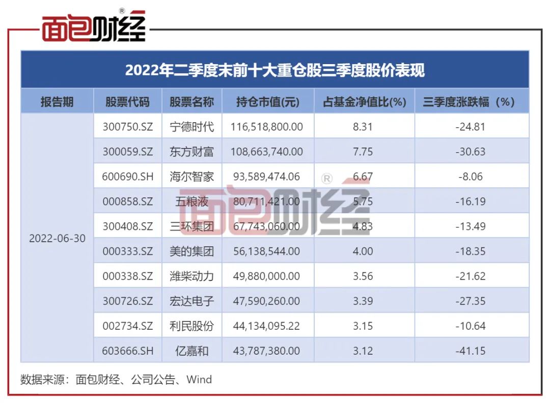 资料显示,2022年二季度末,宁德时代、东方财富分别是该基金的前两大重仓股。但是,这两只股票在第三季度分别下跌24.81%、30.63%。此外,基金当时的第十大重仓股亿嘉和更是在三季度下跌41.15%。