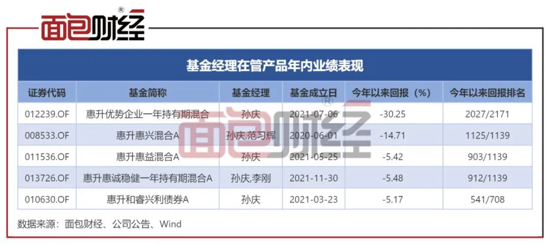 惠升优势企业一年持有期混合的基金经理为公司副总经理孙庆,其管理的2022年之前成立的产品年内业绩普遍排名较为靠后。