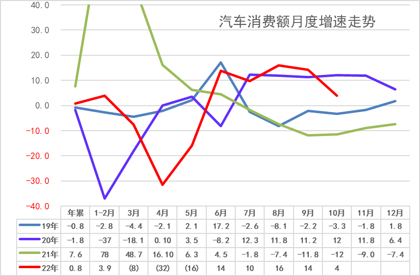 由于今年6月开始的车辆购置税减征政策和2021年下半年基数偏低,2022年6-10月的汽车消费额增长10%左右,并拉动1-10月中国汽车消费增长0.8%,恢复正增长。即使受到近期疫情冲击,但仍效果良好,预期全年将实现正增长。