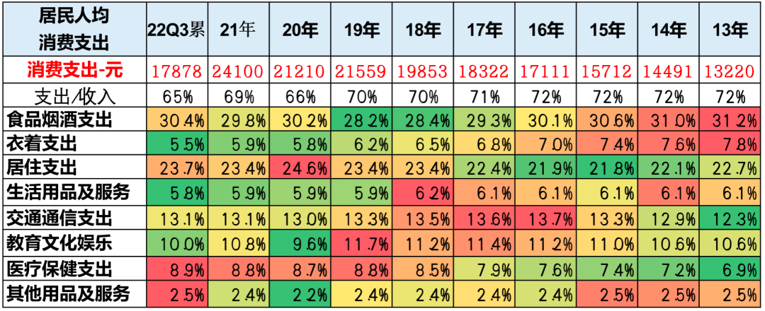 总体来看支出状态,目前增长相对较为明显的是医疗支出,另外就是居住的支出在较高的水平。同时,我们看到衣着支出出现了明显的下降,而生活服务支出也在下降,教育支出在前两年高增长之后,这两年受到抑制占比下降,而交通出行和通讯的支出在不断地下降之中。