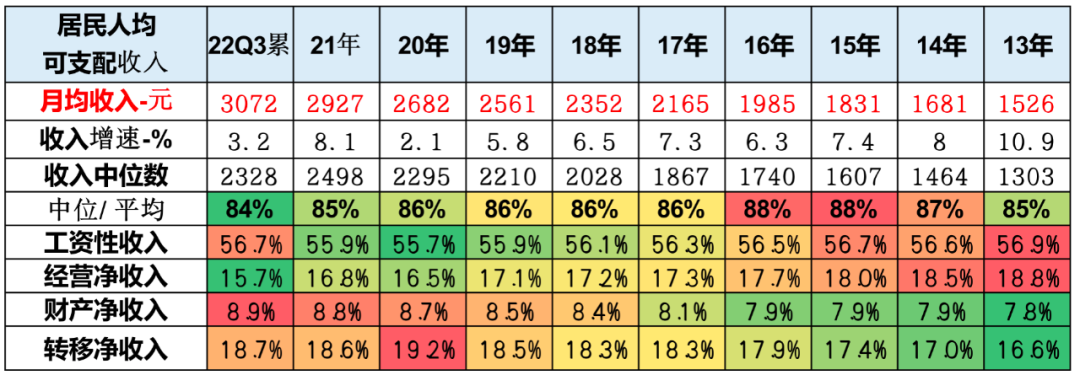 从本世纪初入世以来,中国居民收入不断快速增长,到2021年已经达到月均2927元,今年前三季度又达到3072元水平。其中高收入群体的占比在逐步提升,尤其是从2017年开始,高收入群体的表现日益的突出,2022年前三季度中位收入达到平均收入84%的低位水平,这体现出高收入群体对收入的拉动效果相对突出。