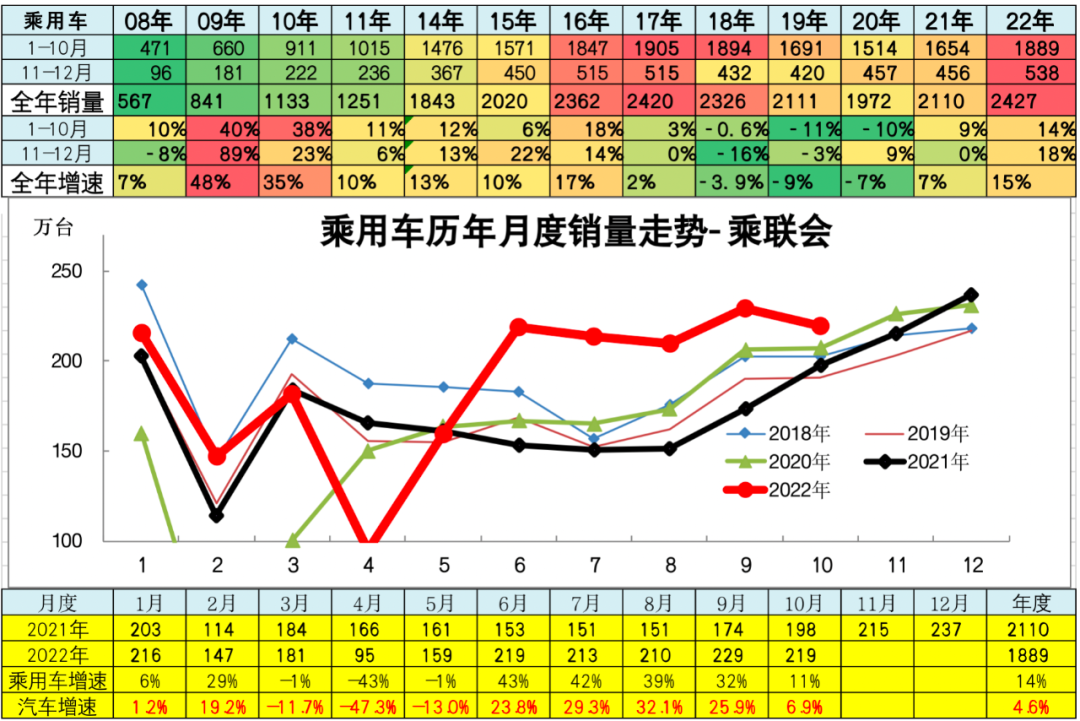 2022年1-10月传统燃油狭义乘用车销量1388万台,较去年同期累计下滑2%;10月传统燃油狭义乘用车销量152万台,较去年同期下降6%,环比上月下降。传统燃油车的走势相对低迷,由于基数偏低,目前传统车也在恢复增长中,但全年已经低于2019年销量较多。常规乘用车的持续下行带来较大的市场压力。