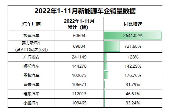 赛力斯在近期公布了11月的销量。数据显示,11月赛力斯新能源汽车销量达11,661辆,同比增长154%;其中,赛力斯汽车11月销量为8,262辆,同比增长335.07%。