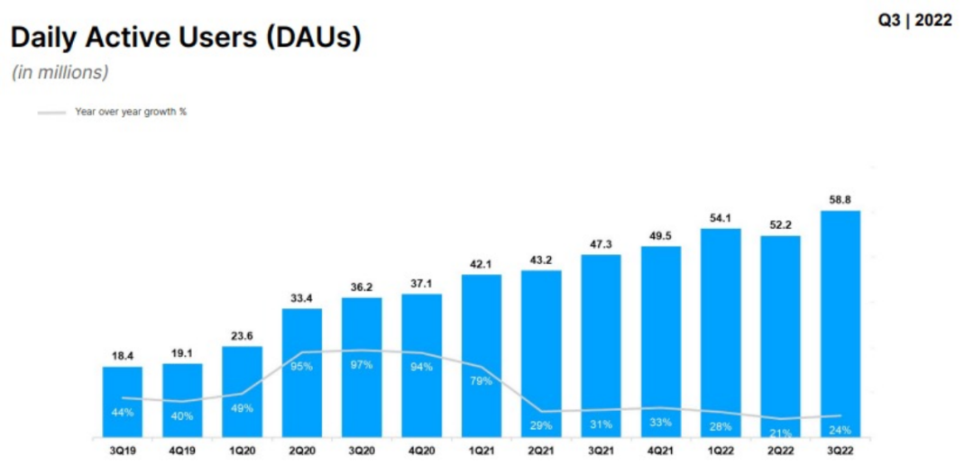 比如财报显示,三季度Roblox的DAU(日活)为5880万,同比增长24%,增速相比去年同期的31%有所下滑,同时平均每DAU的Bookings收入为11.94美元,同比下降11%。这项指标自今年以来每一季度都远低于去年同期水平。