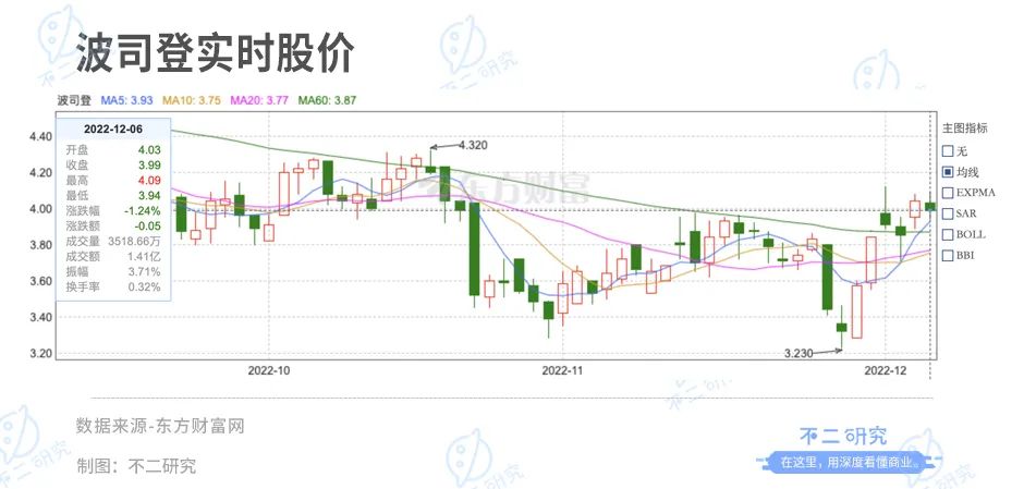 财报公布次日,波司登的股价下跌超10%。截至2022年12月6日收盘,波司登报收3.99港元/股,对应总市值434.4亿港元;相较一年前的市值最高点680亿港元,市值缩水过半。