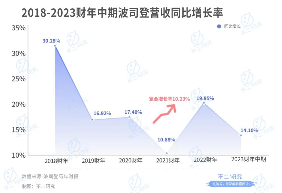 另外,波司登2023财年上半年营收增长率为14.10%,但这主要由于2022财年的低基数。2020财年上半年至2022财年上半年营收的复合增长率为10.23%,亦远低于2019财年上半年的营收增长率。