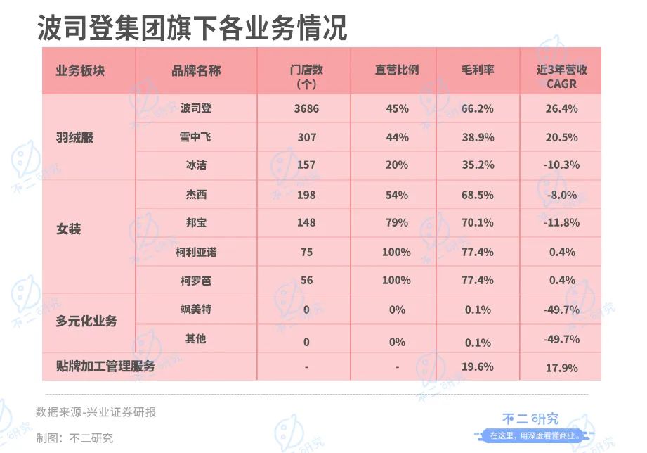 2017年底,波司登痛下决心,砍掉大多数非羽绒服项目,回归羽绒服主业。据兴业证券整理,目前波司登已剔除大部分非羽绒项目,仅留存部分高毛利的中高端女装品牌。
