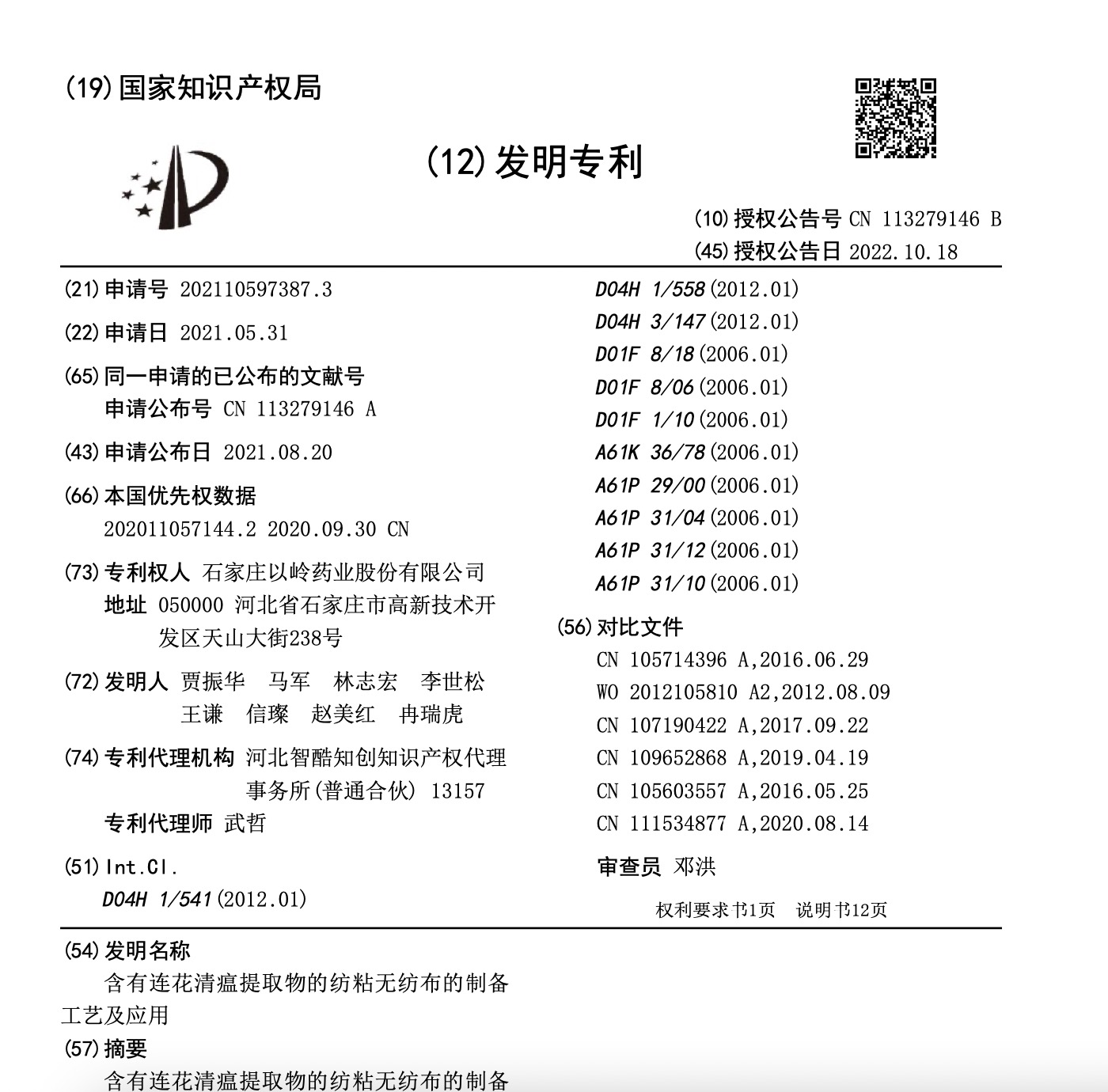 该发明专利名为:含有连花清瘟提取物的纺粘无纺布的制备工艺及应用。专利说明书显示,这种工艺做成的含有连花清瘟提取物成分的无纺布,可应用在皮肤接触的衣物、或家用纺织品、或医用防护品,以提高人体免疫力,效果最明显的是用于口罩中。