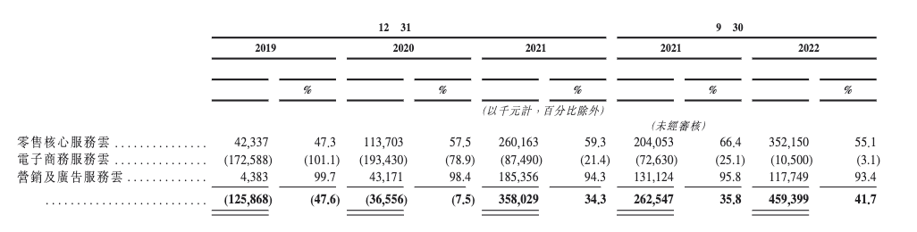 从各项业务的毛利率来看,2022年前9个月,零售服务云毛利率55.1%,同比减少11.3个百分点;电子商务云毛利率-3.1%,同比提升22.0个百分点;营销及广告服务云毛利率93.4%,同比减少2.4个百分点。