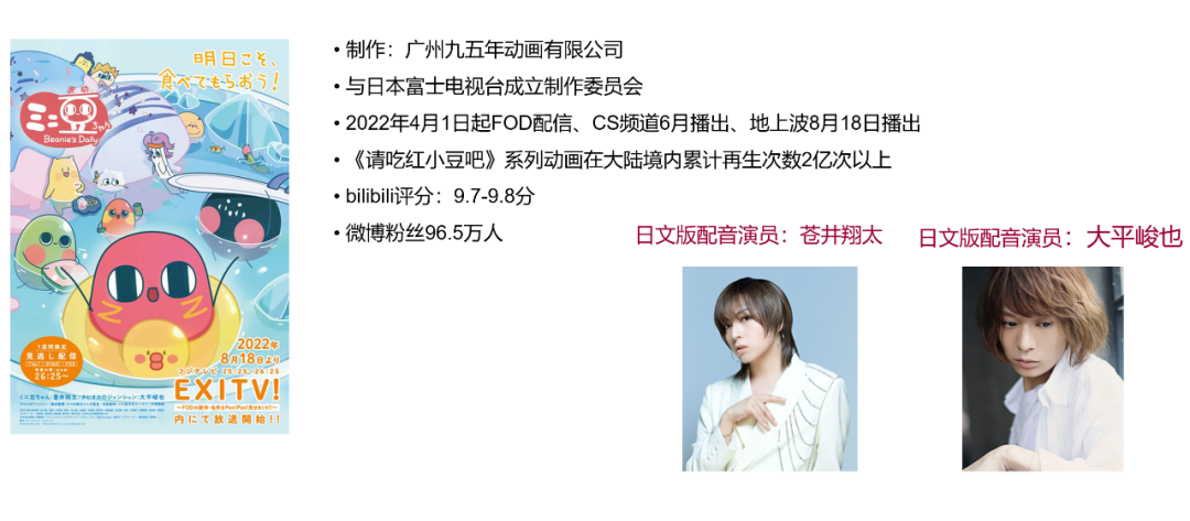 我们推广的另外一部国创动画《请吃红小豆吧!》,日配版声优是在日本有一定知名度的演员、歌手苍井翔太,他的粉丝也会因此关注到这个作品。其实小红豆本身也是一个非常温暖、搞笑而且很励志的系列作品,已经有过几年的番剧发行积累,基础数据非常好,形象也很可爱,下一步我们准备推进一些电影项目。