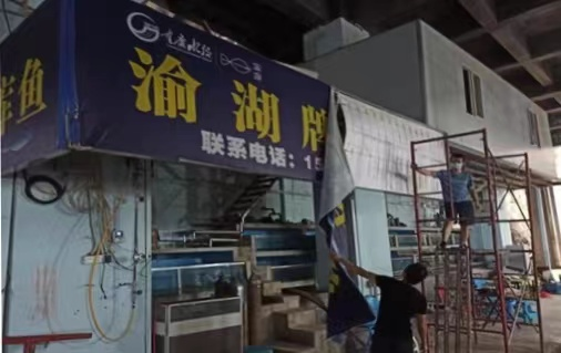 位于渝北区大竹林的众合余水产经营部,赫然挂着重庆水投集团“渝湖牌水库鱼”的招牌,执法部门工作人员及两江渔业专项行动组在走访中发现,该商家卖的并不是正宗的渝湖牌水库鱼。在鱼身及包装上并没有渝湖牌商标,商家的进货渠道也非两江渔业。